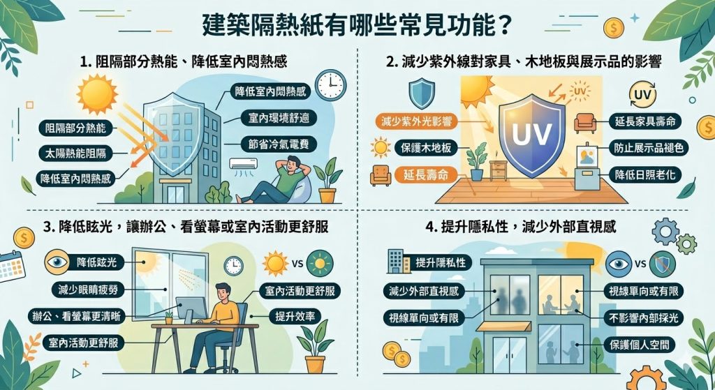 A:常見功能包括阻隔熱能、降低紫外線、減少眩光、提升隱私,以及改善住宅或商業空間的整體舒適度。